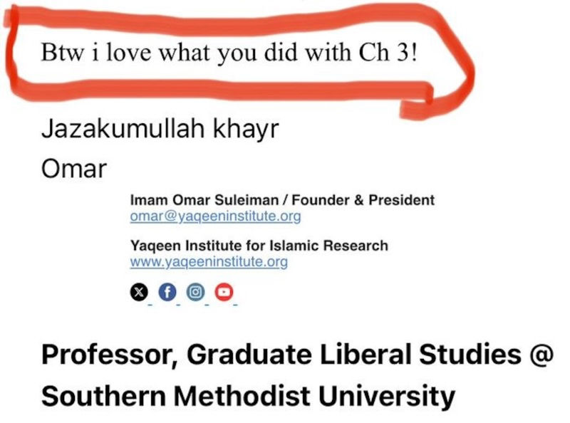 They are not interpretations. They are not second-hand claims. They are direct communications originating from Omar Suleiman himself, exchanged during the period in which his doctoral dissertation was being completed. In these messages, Omar Suleiman explicitly requests assistance that goes far beyond proofreading or general feedback. The language used makes clear that he was seeking structural guidance, substantive contributions, and written material for specific sections of his dissertation.
